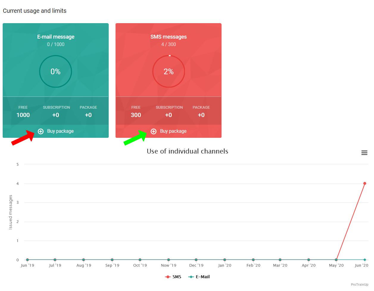 Hier können Sie auch die aktuellen Statistiken zum Paketverbrauch einsehen. Um ein zusätzliches SMS- oder E-Mail-Paket zu kaufen, klicken Sie auf die im Bild angezeigte Schaltfläche "Paket kaufen". Nach dem Klick gelangen Sie zur Seite für den Kauf von Nachrichtenpaketen. Beachten Sie, dass jedes gekaufte Paket bis zum letzten Tag des Monats gültig ist! Das ungenutzte Paket wird nicht in den nächsten Monat übertragen!