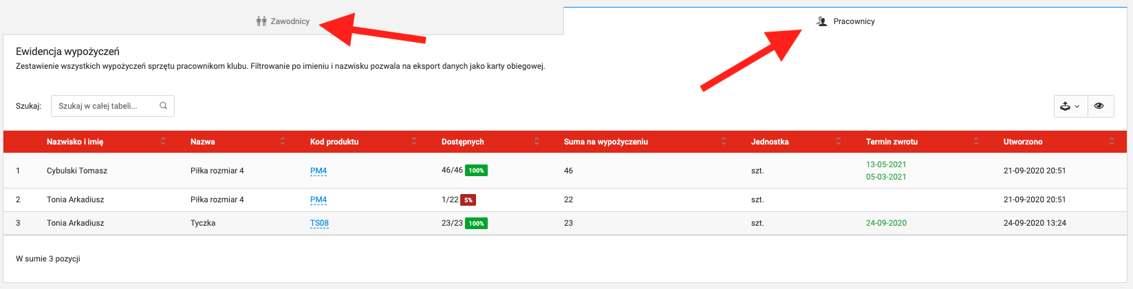This module allows you to quickly check the products rented and the borrowers. To check the data, select the tabs from the left menu club equipment and warehouse equipment and items equipment inventory. The page shows the quantity of borrowed items and their due date. You can see items borrowed by both players and trainers.