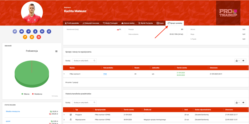 You can filter the equipment by the content of specific columns. To filter by name, type the name in the search box. You can download the filtered breakdown in xls, cvs or PDF format. To do that, press the button above the table on the right and choose the file format. You can also see the breakdown of items borrowed by individual players in their profiles. To access the player’s profile, press his name in the list of players tab, then press the "equipment and products" tab at the top.