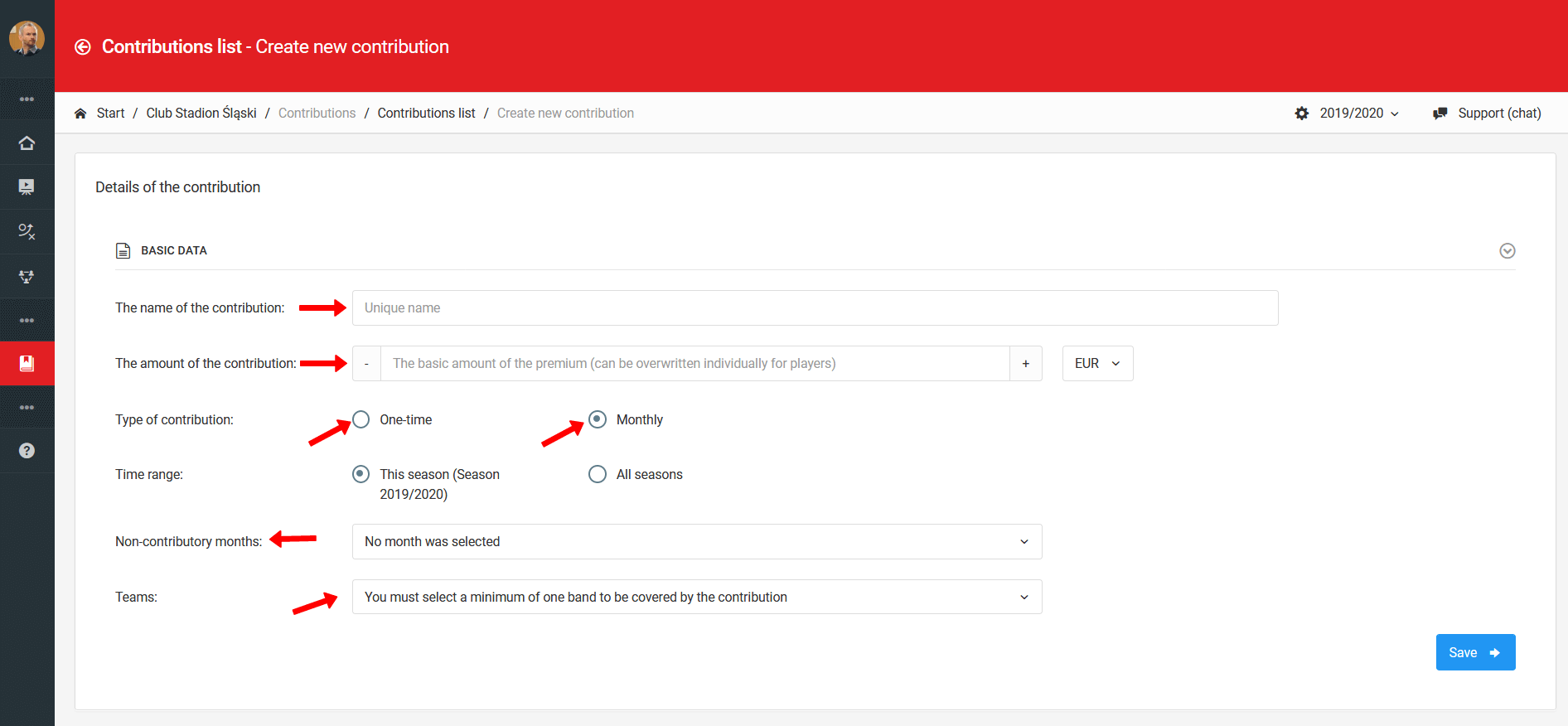 O sistema oferece a possibilidade de criar dois tipos de contribuições: uma contribuição única e uma contribuição mensal. Antes de criar contribuições, é uma boa prática completar o processo de configuração das listas de jogadores para cada equipe e criar uma temporada ativa para todas as equipes. Sem a temporada criada, você não poderá atribuir uma contribuição a uma equipe. A criação de uma contribuição é possível tanto no nível do treinador quanto do gerente da conta do clube. Ao criar uma contribuição como treinador, você só pode atribuí-la à equipe que está liderando. Ao fazer isso como administrador, você pode criar uma contribuição para todas as equipes de uma vez. Para prosseguir com a criação da contribuição, como treinador, selecione no menu à esquerda diário contribuições criar nova contribuição. Se você deseja criar uma contribuição no nível de administrador, escolha no menu à esquerda clube contribuições criar nova contribuição.